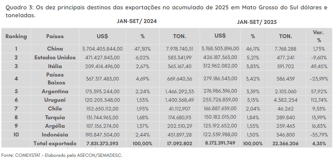 A China permanece como o principal destino dos produtos sul-mato-grossenses, absorvendo 46,11% do total exportado. O valor negociado com o país asiático atingiu US$ 3,76 bilhões, um leve aumento de 1,73% em relação a 2024. Os Estados Unidos seguem como o segundo maior comprador, com 5,21% de participação, embora as vendas para o país tenham recuado 9,6%.