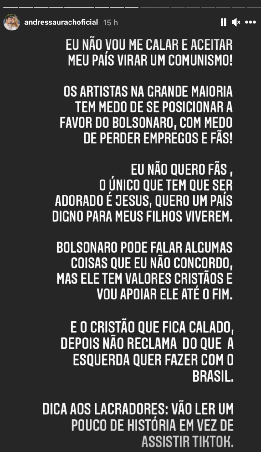 “Eu não vou me calar e aceitar meu país virar um comunismo! Os artistas na grande maioria tem medo de se posicionar a favor do Bolsonaro, com medo de perder empregos e fãs! Eu não quero fãs, o único que tem que ser adorado é Jesus”, disse ela, em um post no Instagram, que posteriormente foi removido.