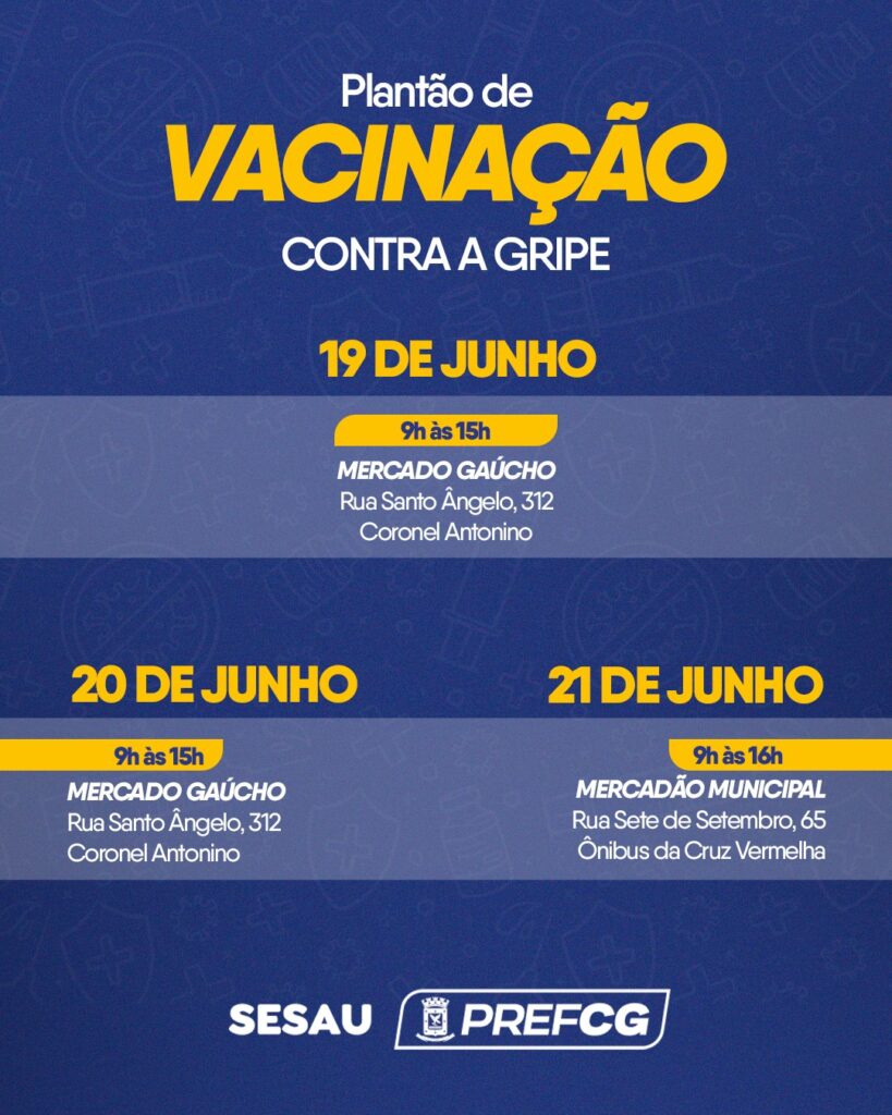 A Secretaria Municipal de Saúde (Sesau) de Campo Grande realiza, entre os dias 19 e 21 de junho, um plantão especial de vacinação contra a gripe.