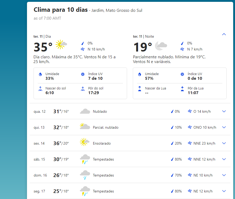 Na Grande Dourados, o dia de hoje é claro, com mínima de 18°C e máxima de até 34°C. Por lá, já deve ter chuva nesta 4ª-feira (12. agosto), com probabilidade ainda tímida de 10%. No final desta semana deve chover e com o alívio também vem a preocupação, a climatologia indica tempestades com ventos de até 12km por hora no município.