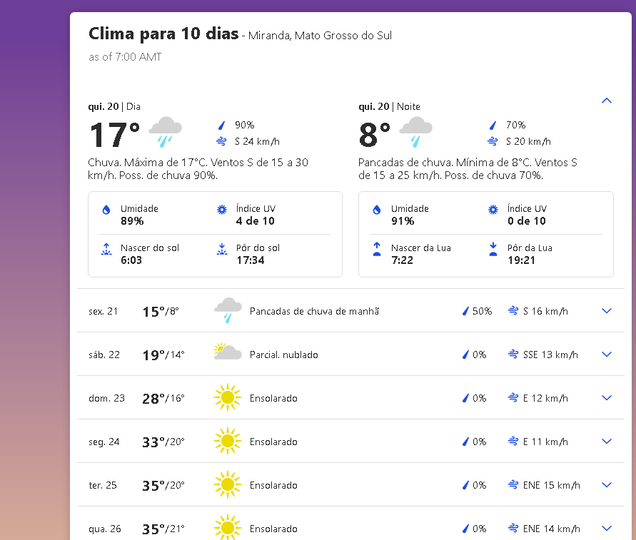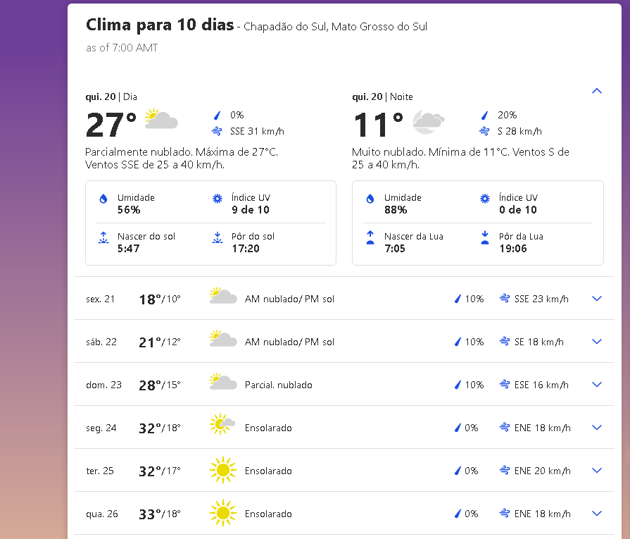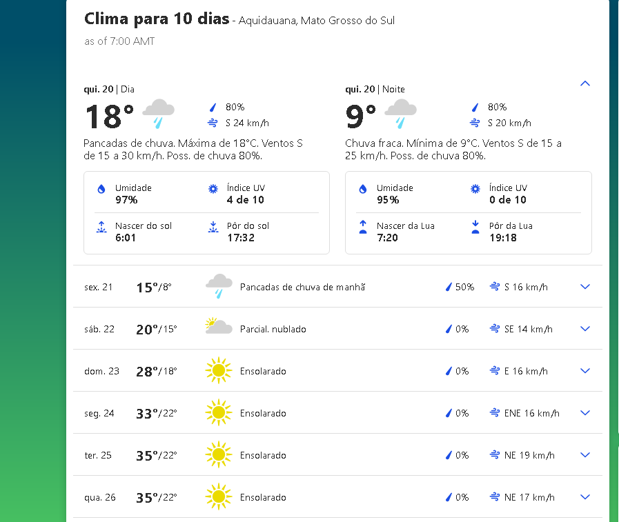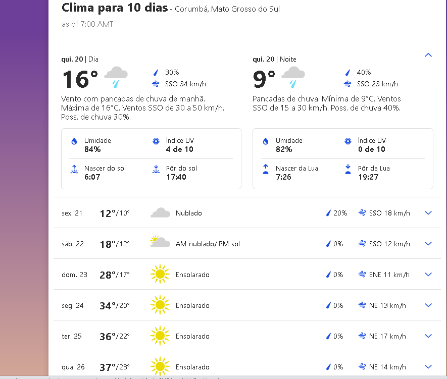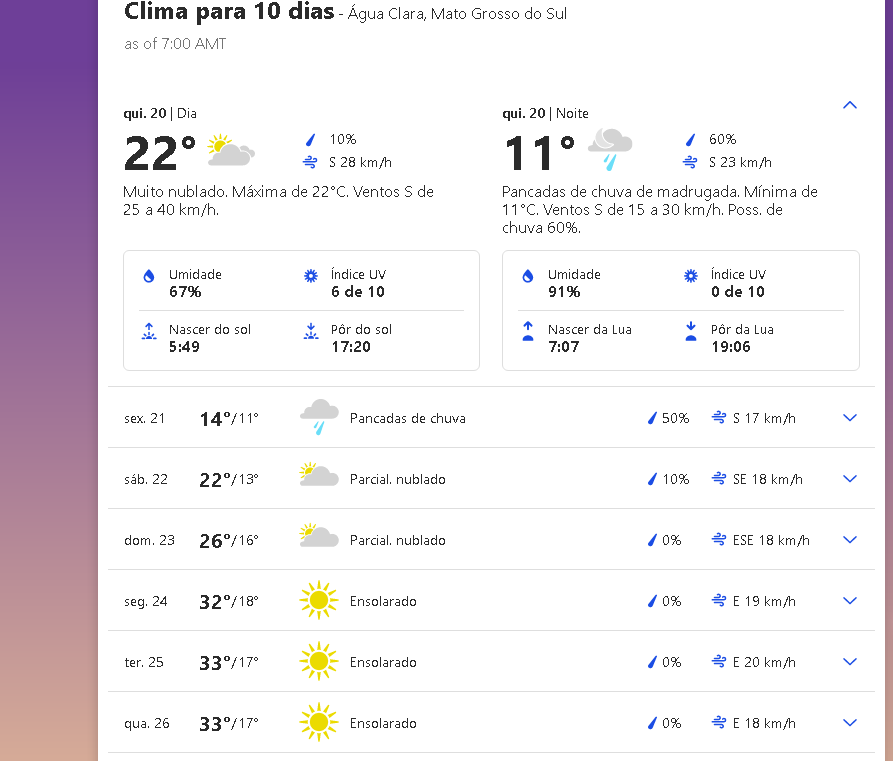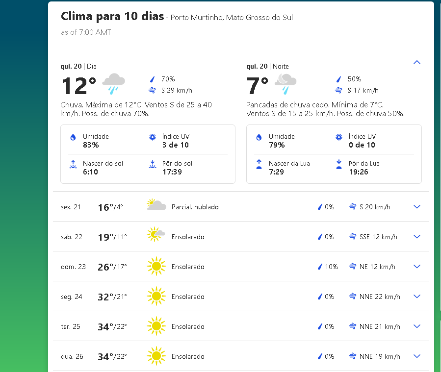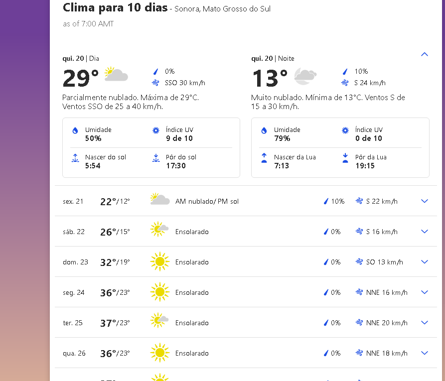 Nesta mesma região está Sonora, que registra mínima de 13°C nesta 5ª-feira, mas também quase não deve aproveitar o frio. O município já indica elevação e retorno do calor na segunda-feira (24. agosto).