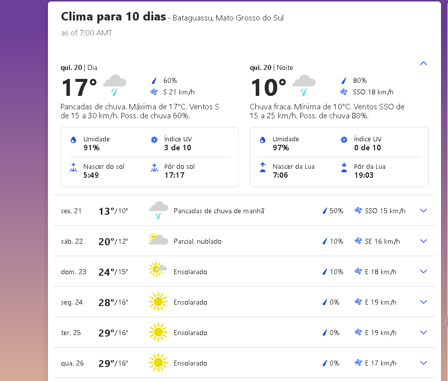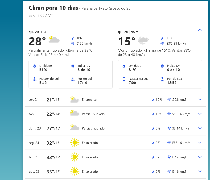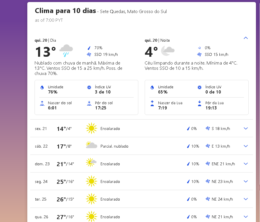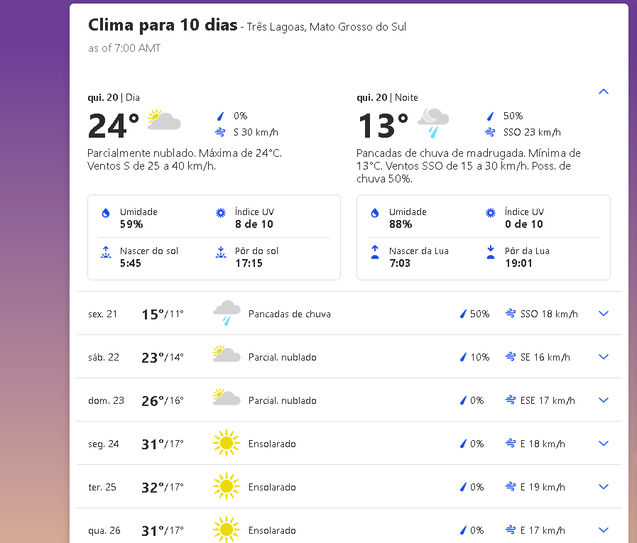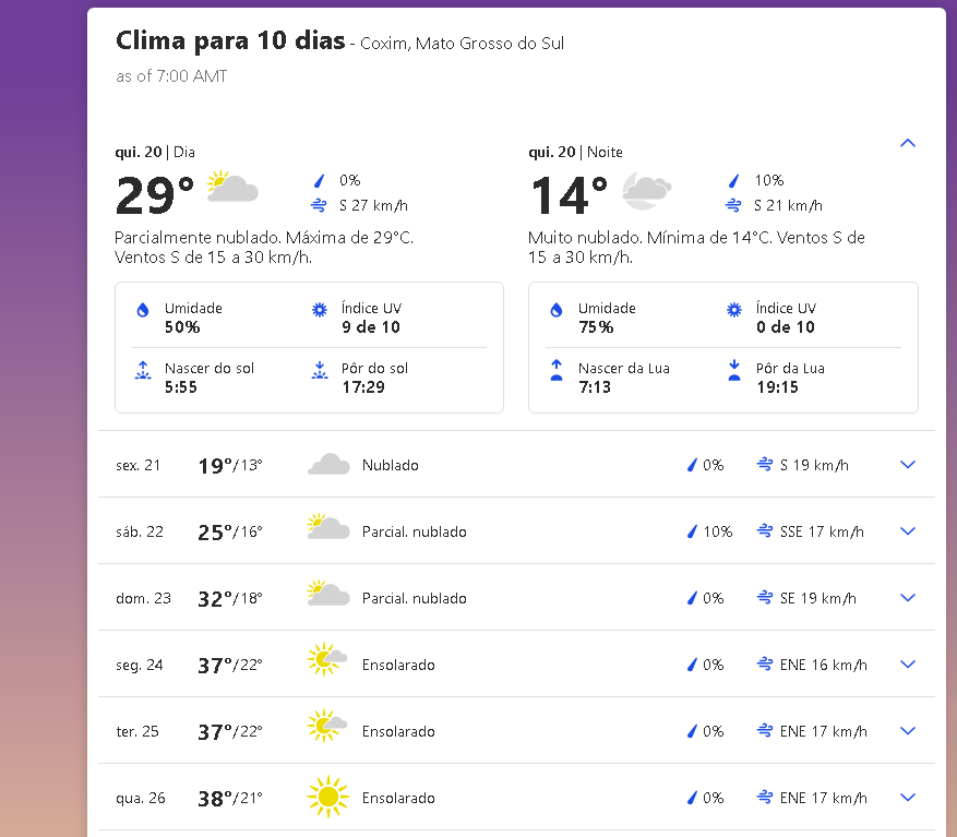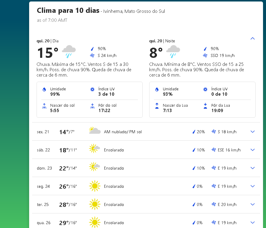 Nesta mesma região está Sonora, que registra mínima de 13°C nesta 5ª-feira, mas também quase não deve aproveitar o frio. O município já indica elevação e retorno do calor na segunda-feira (24. agosto).
