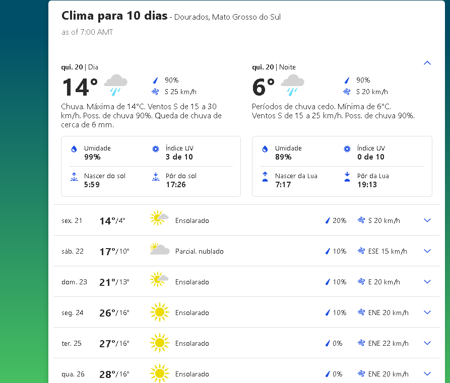 Já ao Sudoeste do Estado, Dourados, também deve ter uma 6ª-feira gelada. Nesta 5ª-feira a mínima no município é de 6°C. O clima permanece fresquinho nos próximos dias por lá.