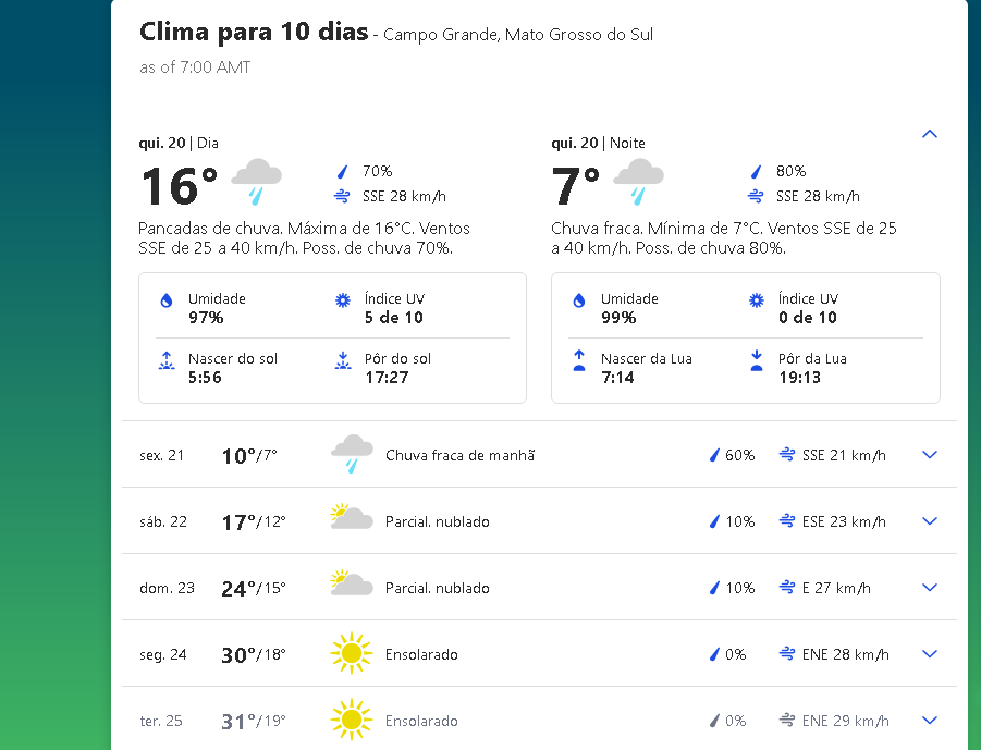 Na Capital, Campo Grande, chove pela manhã e a tarde a máxima atinge os 16°C. O clima volta a subir na próxima segunda-feira (24. agosto).