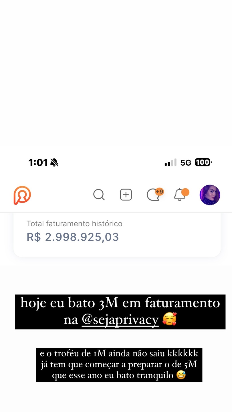 Na publicação, ela mostra um print do histórico total de seu faturamento, que revela o valor de R$ 2.998.925,03. Mari ainda escreveu: “Hoje eu bato três milhões em faturamento na Privacy".