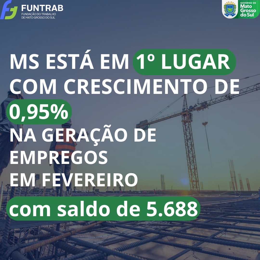 Em Mato Grosso do Sul, a Fundação do Trabalho (Funtrab), compôs um documento (eis a íntegra) afirmando que o estado é o 1º colocado na geração de empregos no mês de fevereiro. Uma arte gráfica na rede social da Funtrab fez tal sustentação. Veja: