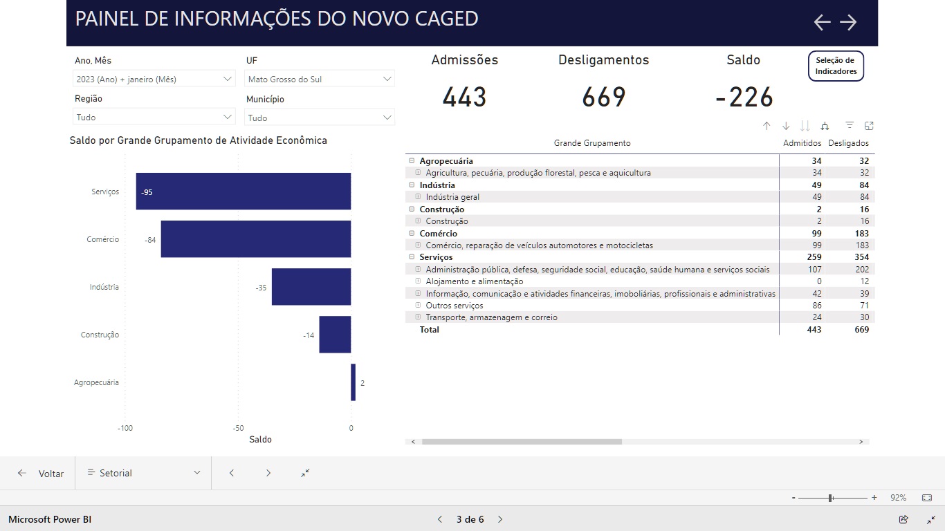 De acordo com a Painel de Informações do Novo Caged, Mato Grosso do Sul admitiu 443 pessoas em janeiro e desligou 669, isso deu ao estado um saldo negativo de 226. Veja no gráfico abaixo, a relação de áreas que mais contrataram e mais despediram trabalhadores em MS:
