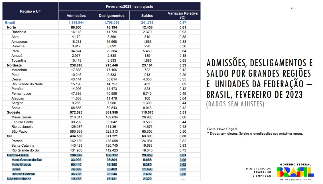 A Funtrab, considerou o crescimento dos empregos apenas entre os meses de janeiro e fevereiro de 2023. Na tabela do Caged, de fato, Mato Grosso do Sul foi o estado que mais empregou nos dois primeiros meses deste ano, tendo alcançado 0,95% — o maior percentual entre todos os estados da federação. Eis a tabela: