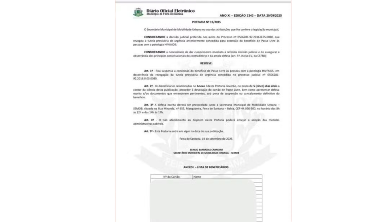 A Prefeitura de Feira de Santana (BA) publicou no sábado (20.set.25), no Diário Oficial, uma lista com nomes de mais de 600 moradores que vivem com HIV.