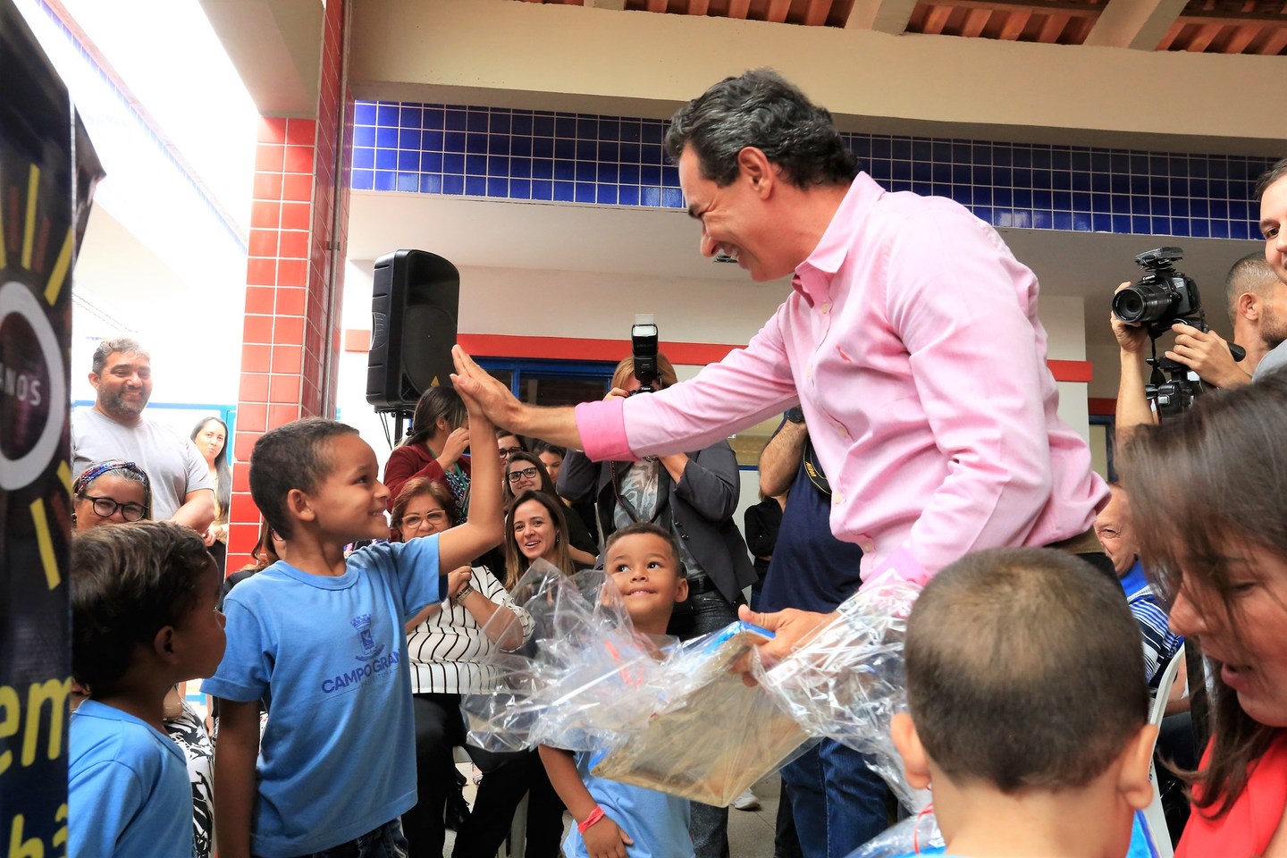 O prefeito e crianças durante solenidade. Outra novidade é a inclusão de turmas de berçário. Com isso, a nova EMEI atenderá o quadro completo da Educação Infantil, abrangendo do grupo 1 (antigo berçário) até o grupo 5 (Pré-Escola) , que é de crianças de zero a cinco anos.