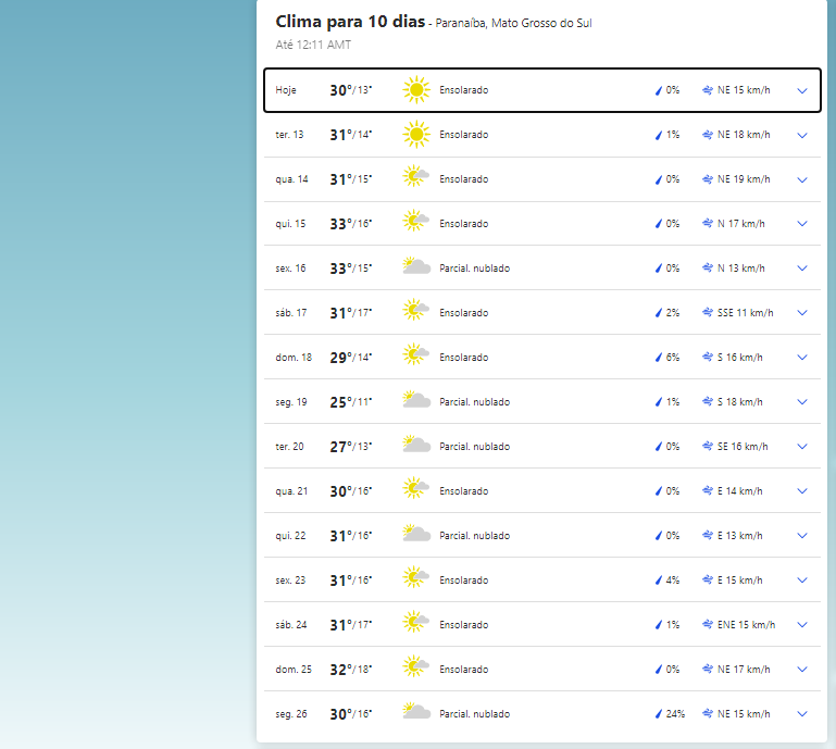 Campo Grande inicia a semana com dia claro. A mínima hoje (12.jul) será de 18°C e a máxima de 30°C. Os ventos NNE - entre o norte (N) e o nordeste (NE), vão de 25 a 40 km/h. A previsão para a cidade nos próximos 10 dias, aqui estimada pelo IBM, é de que haja queda gradativa e a chegada de uma nova frente fria.