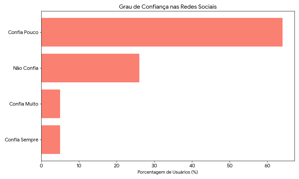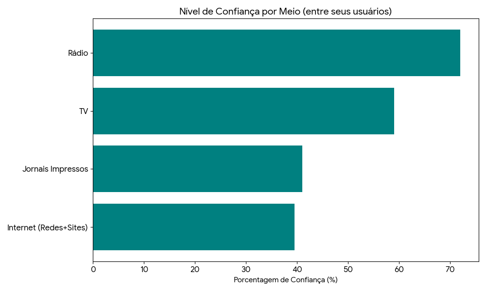 O evento contou com palestras de Fernando Morgado, Marina Alves e Frederico Souza, que enriqueceram o debate com dados e reflexões sobre o papel atual e futuro dos meios de comunicação. Foto: MidiacomMSEmbora as redes sociais sejam a fonte de informação mais utilizada tanto na capital (63%) quanto no interior (64%) , a confiança nelas é extremamente baixa. A pesquisa revela um forte contraste: apenas 1 em cada 10 usuários confia plenamente nas notícias que consome em plataformas digitais , com 64% admitindo ter pouca confiança e 26% declarando não confiar de forma alguma.