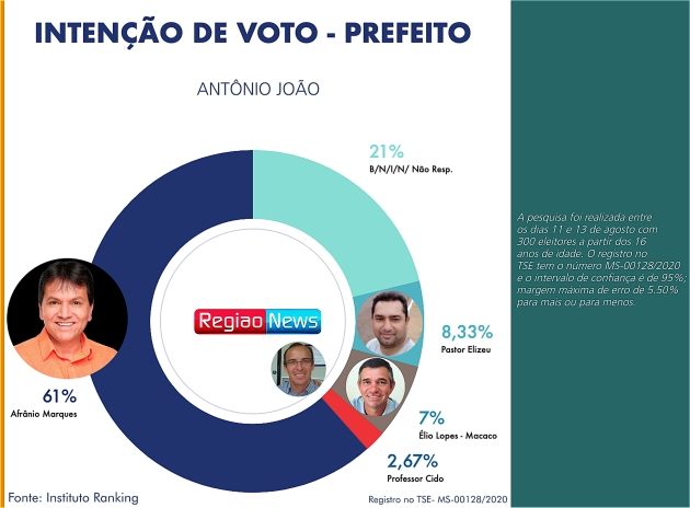 Se as eleições fossem hoje, Afrânio Marques, o ex-secretário municipal de Governo e peça-chave da vitoriosa administração da prefeita Márcia Marques (MDB), seria eleito para o comando político-administrativo de Antonio João. É o que apontam os resultados de uma amostragem da Ranking Comunicação e Pesquisas, que apurou as intenções de voto de eleitores deste município na fronteira com o Paraguai, a 325 km de Campo Grande.