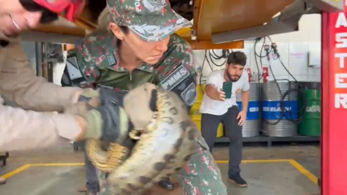 Diante da dificuldade de acesso, os agentes optaram por levar a camionete até uma empresa onde o veículo pudesse ser suspenso com segurança. Com o carro elevado, a sucuri foi retirada sem ferimentos, avaliada e solta em área de habitat natural.