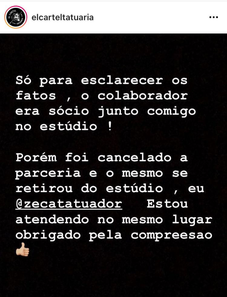 Segundo o estúdio de tatuagem El Cartel Tatuaria, Rodrigo era sócio do estabelecimento, mas um acordo entre as partes resultou no desligamento dele da empresa. “O estúdio elcarteltatuaria não compactua com qualquer tipo de incitação à violência contra mulher! Deixando bem claro que o colaborador foi demitido do estúdio, sendo assim não fazendo mais parte do quadro de funcionários”, declarou o estúdio, em nota nas redes sociais.