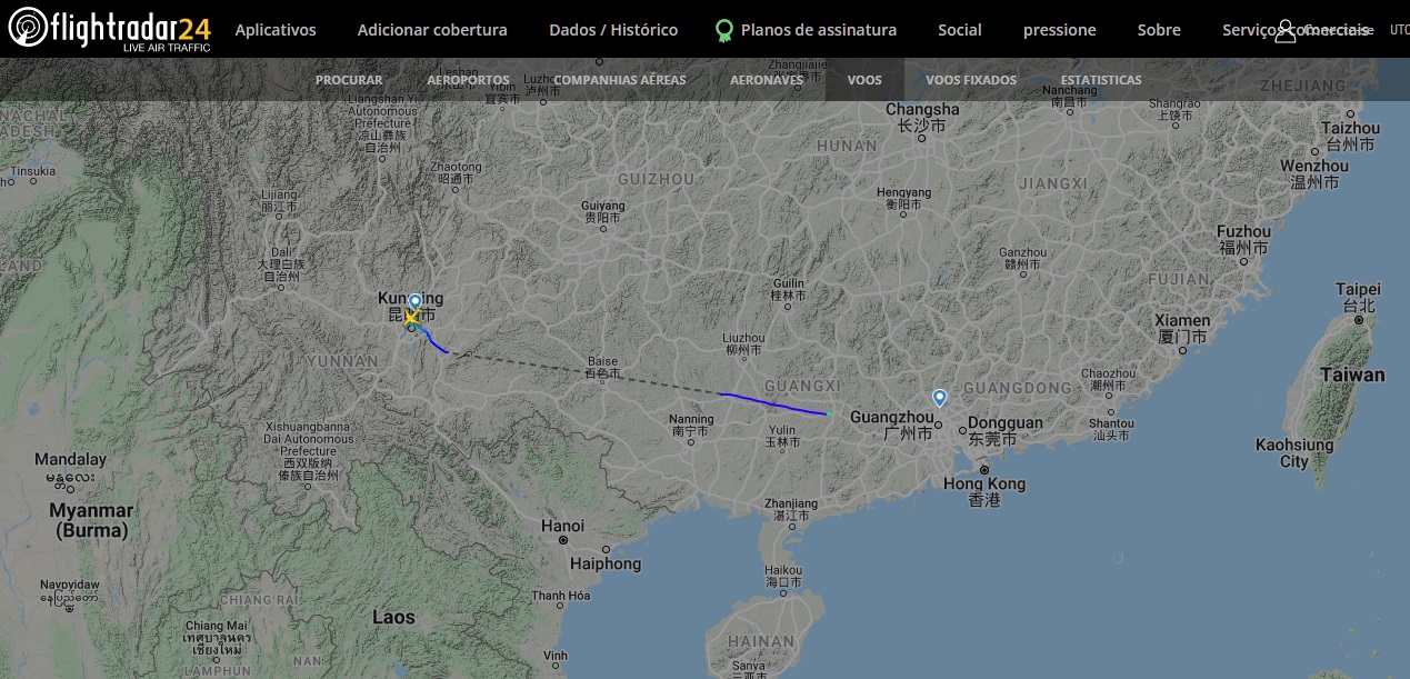O site Flight Radar mostra que o Boeing teve pouco mais de uma hora de voo, antes de cair. No gráfico de monitoramento do voo é possível ver que a aeronave perde altitude de forma rápida, na região de Wuzhou.