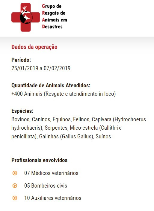 Um balanço no site do GRAD aponta que foram resgatados mais de 400 animais entre 25 de janeiro e 07 de fevereiro de 2019, e que a equipe do Grupo de Resgate contou com 7 médicos veterinários, 5 bombeiros civis e 10 auxiliares veterinários em sua atuação.