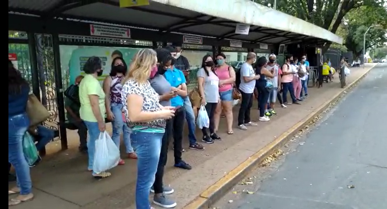 Um vídeo gravado hoje (2) no ponto de ônibus, na rua 13 de Maio, que fica localizado na Praça Ary Coelho, centro de Campo Grande, mostra dezenas de pessoas esperando o transporte público.