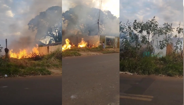 Segundo uma moradora, o fogo se espalha rapidamente, se aproximando de fios de energia, residências e de outro terreno localizado na rua de trás.