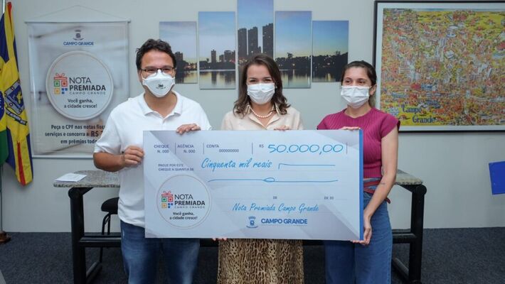 A Prefeitura de Campo Grande entregou nesta quarta-feira (15) a premiação do 10º sorteio da Nota Premiada Campo Grande/2021. Foram R$ 70 mil em dinheiro no total, distribuídos para 3 ganhadores que receberam R$ 50 mil (1º sorteado), R$ 15 mil (2º sorteado) e R$ 5 mil (3º sorteado)