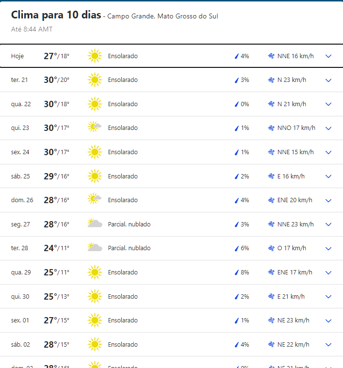Campo Grande continuará com mínimas de até 11°C nos próximos 10 dias. A estimativa climática é do Portal do Tempo IBM.