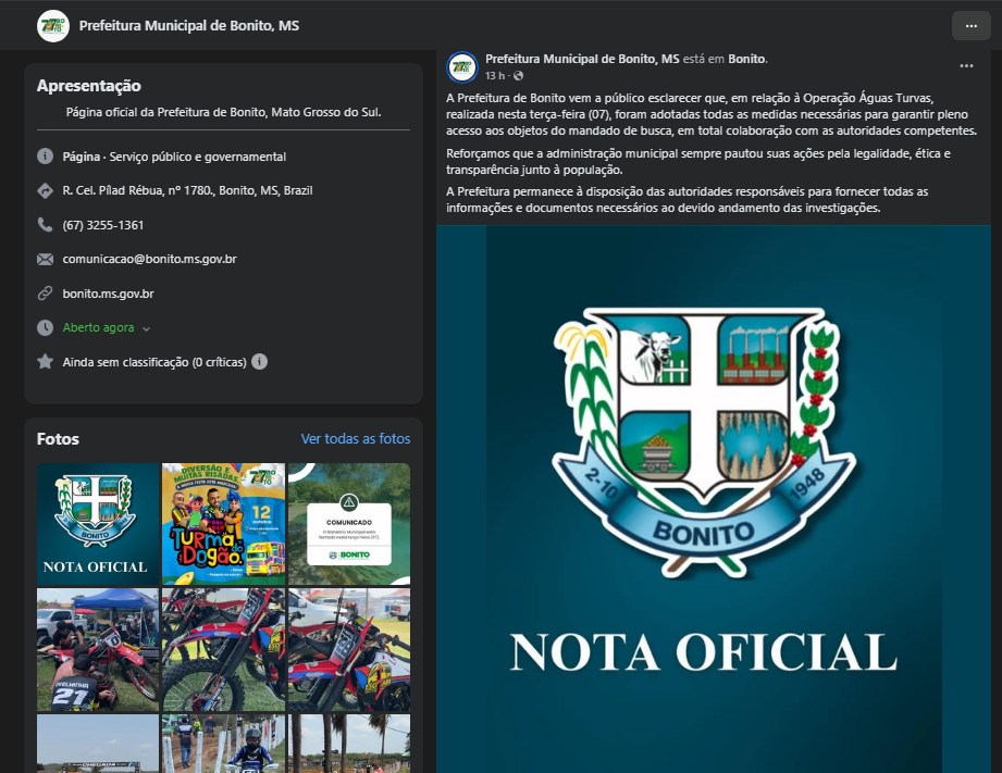 A Prefeitura de Bonito vem a público esclarecer que, em relação à Operação Águas Turvas, realizada nesta terça-feira (07), foram adotadas todas as medidas necessárias para garantir pleno acesso aos objetos do mandado de busca, em total colaboração com as autoridades competentes.
