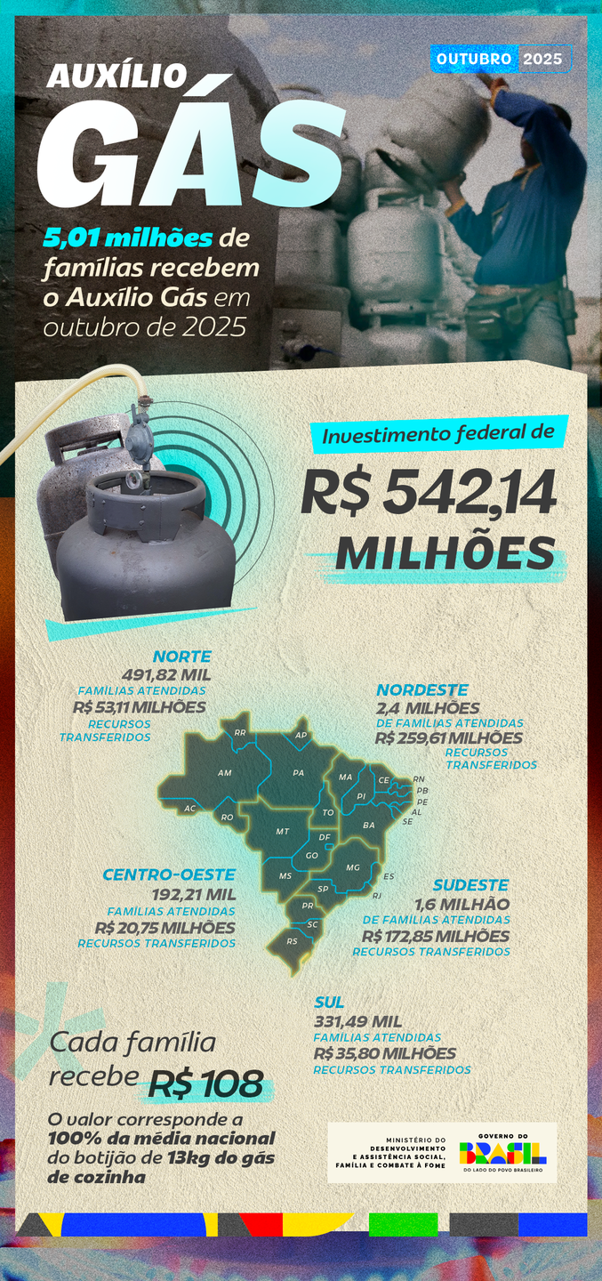 O pagamento do Auxílio Gás começa nesta 2ª feira (20.out.25) em todo o país.