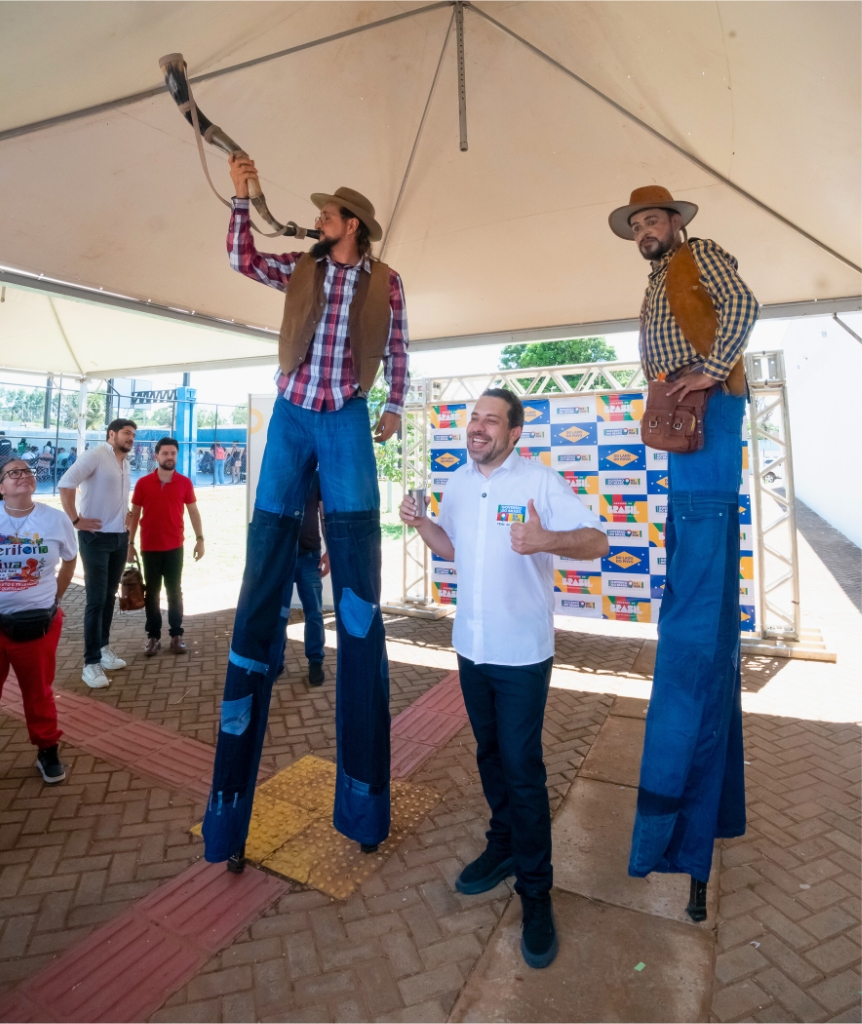 O palhaço Tcholo durante apresentação circense na Feira da Cidadania. Foto: Tero Queiroz A programação artística serviu de "imã" para a política. O picadeiro montado no CEU, com o Grupo Circo do Mato, a Cia Pisando Alto e o Palhaço Tcholo, garantiu que a mensagem chegasse às famílias, misturando ludicidade com a presença do Estado.