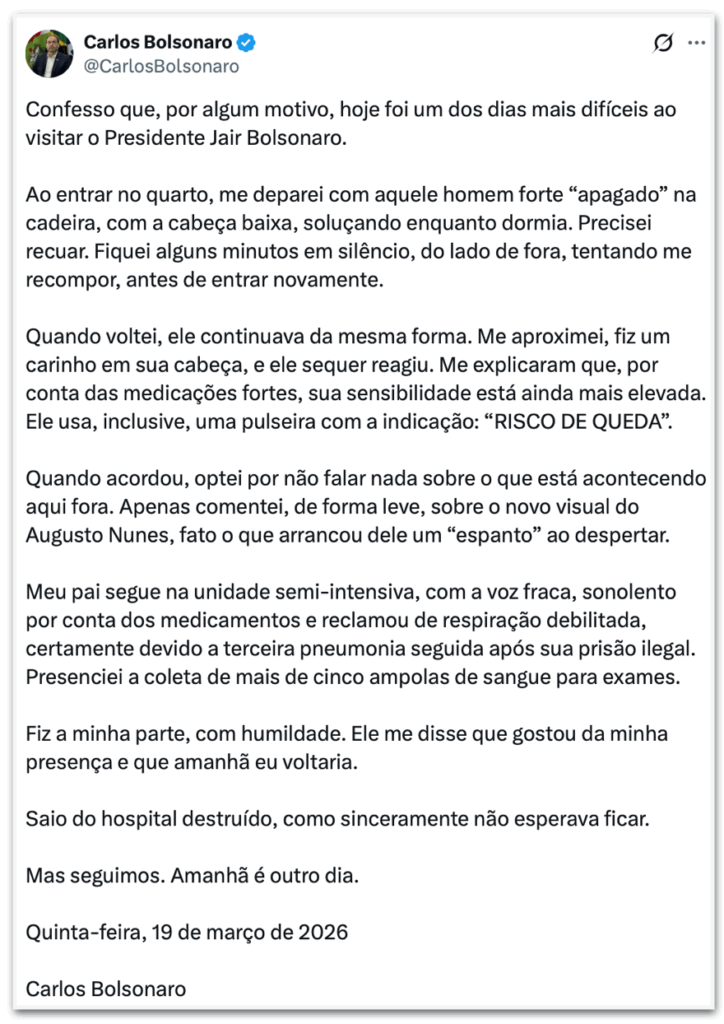 Em publicação na 5ª.feira (19.mar.26), nas redes sociais, Carlos afirmou ter vivido “um dos dias mais difíceis” ao visitar o pai no Hospital DF Star.