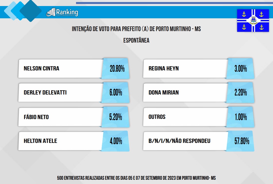 Uma pesquisa divulgada Instituto Ranking Brasil Inteligência mostra o atual prefeito de Porto Murtinho, Nelson Cintra (PSDB), como favorito na disputa à reeleição.