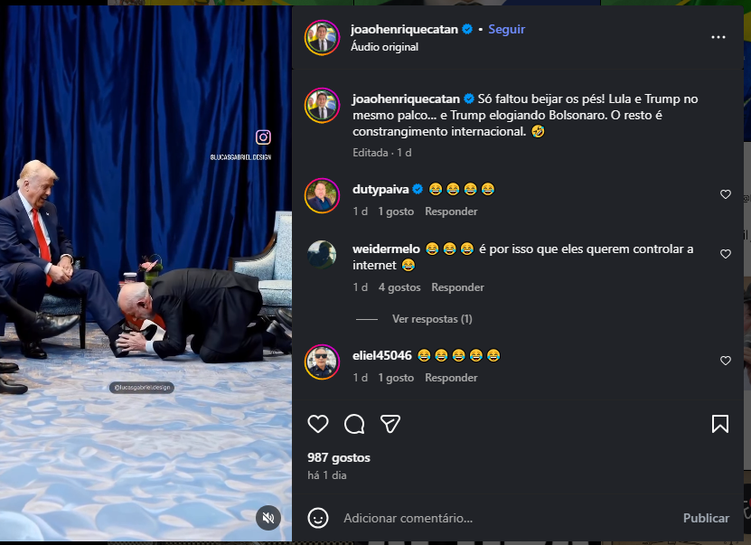 Nas redes, a montagem grotesca criada por Catan mostrava Lula ajoelhado diante de Trump, em uma tentativa patética de reescrever a realidade. A imagem falsa circulou em grupos bolsonaristas, reacendendo o velho vício da extrema direita: transformar fatos em ficção, e ficção em discurso político.