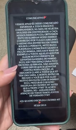 “Já deixamos claro a todos que só tem uma saída: a morte. Então um recado a você que por algum motivo envolveu com os inimigos PCC, procurar o quadro disciplina de Cáceres antes que a tropa CVMT te ache”, diz trecho da mensagem.