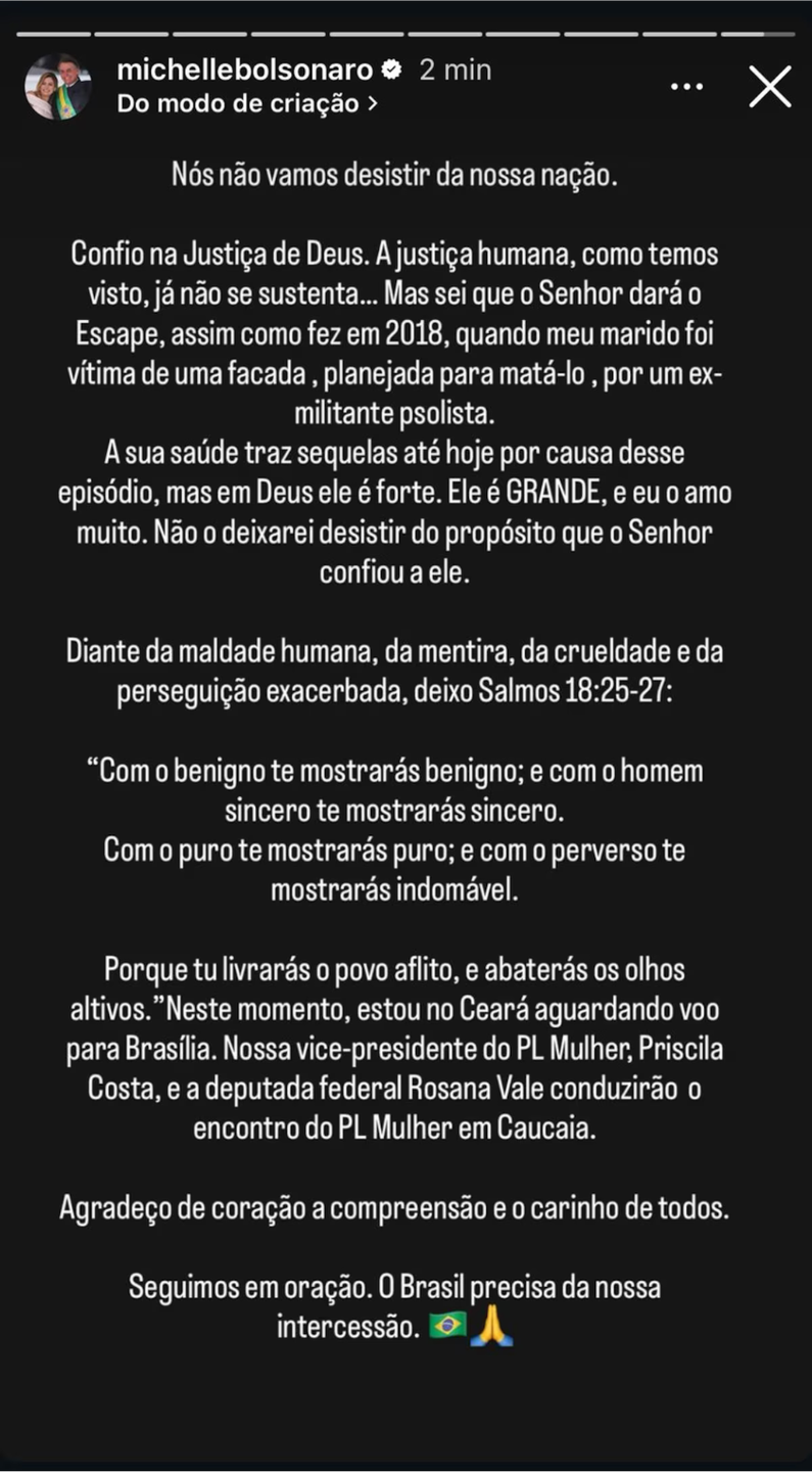 “Confio na Justiça e Deus. A justiça humana, como temos visto, já não se sustenta... Mas sei que o Senhor dará o Escape, assim como fez em 2018, quando meu marido foi vítima de uma facada, planejada para matá-lo, por um ex-militante psolista”, escreveu Michelle, em menção ao atentado contra Bolsonaro na campanha das eleições presidenciais daquele ano.