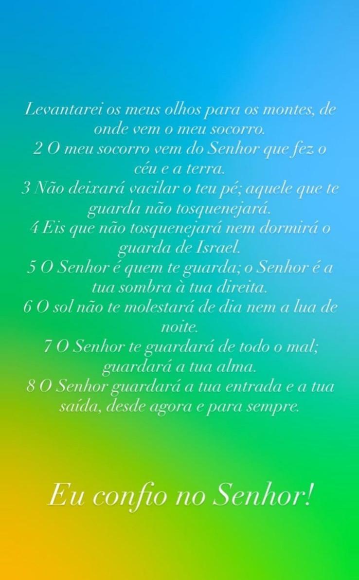 Ela chegou fazer uma oração online nos stories do Instagram com o Salmo 121 foi, portanto, e depois publicou um texto mais longo em que menciona que "confia em Deus" para livrar Bolsonaro da cadeia. V