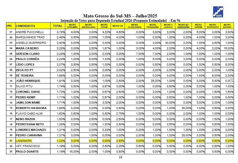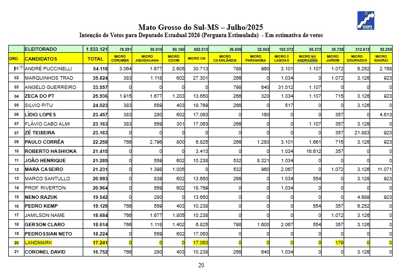 O Idope realizou os levantamentos entre 15 e 27 de julho, em 23 municípios do Mato Grosso do Sul, com dois mil eleitores das zonas urbana e rural. Na pesquisa espontânea, quando o entrevistado responde livremente sem receber lista de nomes, ele ficou na 21ª posição e foi mencionado por 1,23% dos eleitores, o equivalente a 18.805 votos estimados.