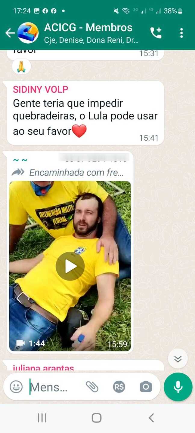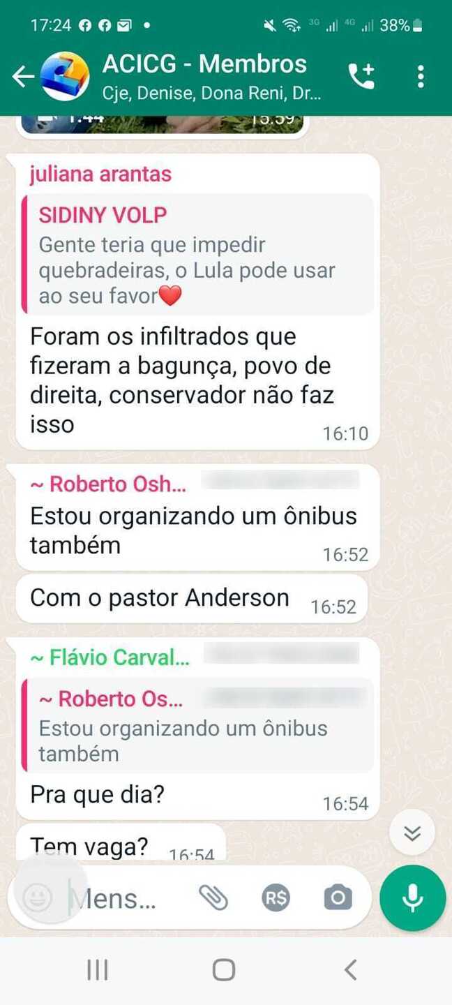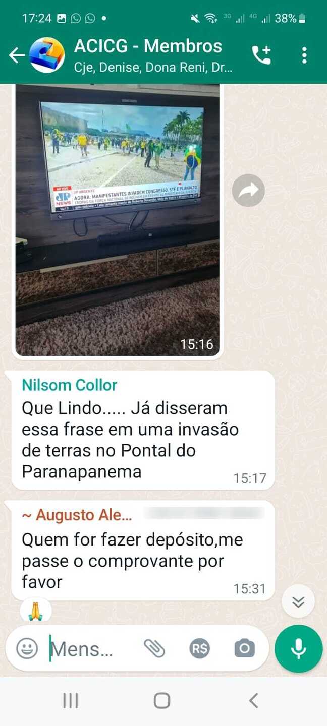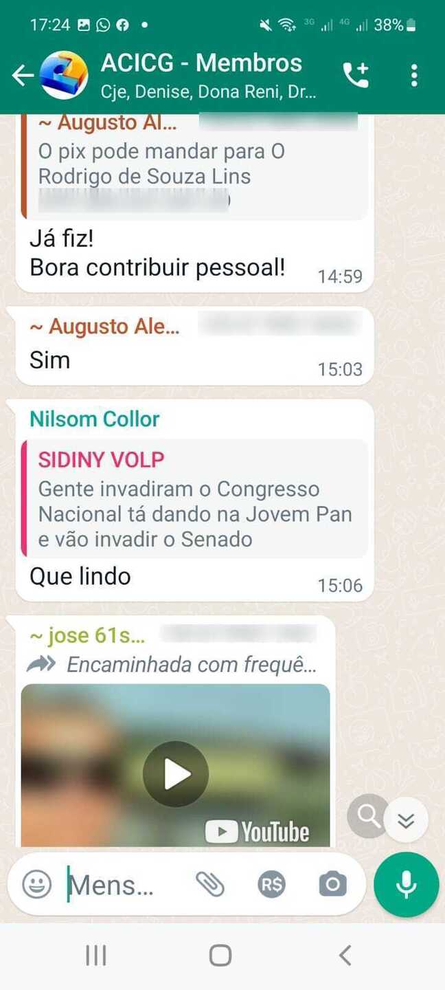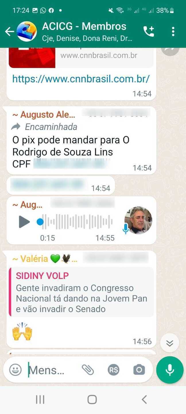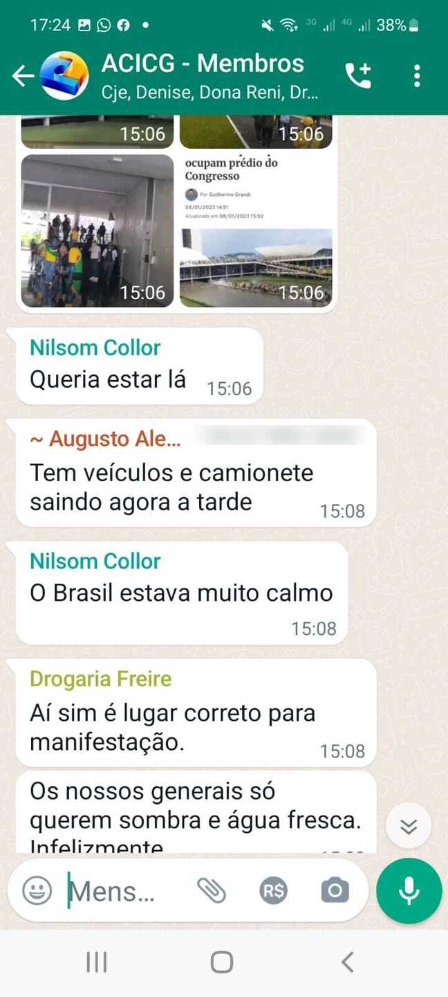 Também participam da conversa Nilsom Collor, Valéria, Jose, Juliana Arantas e Augusto. No grupo é possível ver que estão CJE e Dona Reni.