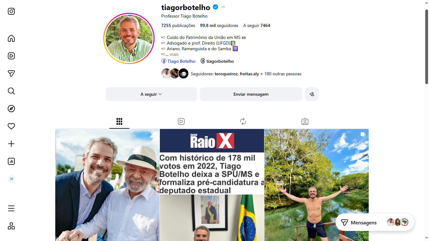 Nestas eleições, também é relevante considerar o desempenho nas redes sociais. Nesse quesito, Botelho reúne quase 100 mil seguidores no Instagram (@tiagorbotelho), com engajamento expressivo, refletido em milhares de curtidas e comentários em suas publicações. Para se ter uma ideia da dimensão desse alcance, o número representa cerca da metade da base da deputada federal Camila Jara, uma das parlamentares com maior presença digital no campo da esquerda em Mato Grosso do Sul.