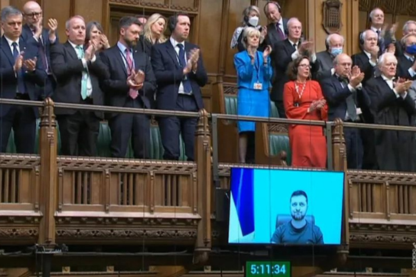 Zelensky foi aplaudido de pé pelos parlamentares antes e depois de seu discurso, no qual comparou a luta da Ucrânia contra a Rússia à luta da Grã-Bretanha na Segunda Guerra Mundial contra a Alemanha nazista.