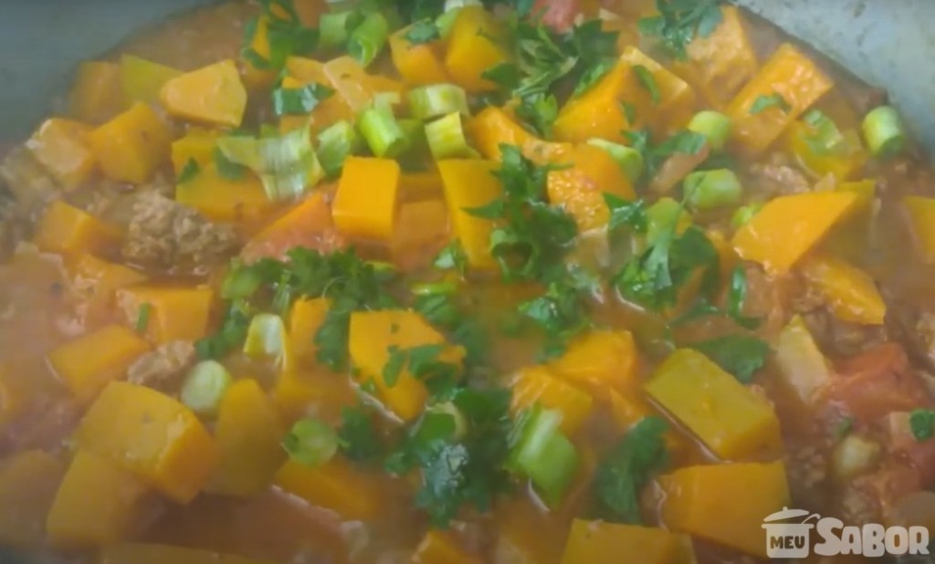 A- A+ Ingredientes 300 gramas de carne moída magra 700 gramas de abóbora 1 cebola 1 tomate salsinha a gosto 100 ml de água 120 gramas de molho de tomate sal e pimenta do reino tempero sírio em pó (opcional) Modo de Preparo Corte em cubinhos a abobora, a cebola e o tomate. Refogue a carne e a cebola, sem usar óleo. Adicione o tomate refogue até o tomate amolecer. Acrescente a abóbora, a água e o molho de tomate, Tampe a panela e deixe por cerca de 15 minutos ou até a abóbora estar macia. Se necessário, coloque mais um pouco de água para não grudar na panela. No final, adicione todos os temperos e sirva! Dicas do Cheff Conte-nos como ficou sua receita, poste fotos, marque e siga-nos no instagram use a #ReceitasMeuSabor. VEJA ESSA RECEITA: Aprenda a fazer Vitela assada no forno, fica uma carne suculenta e macia Fonte: Meu Sabor