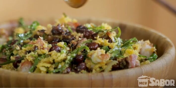 A- A+ Ingredientes 4 xícaras de feijão cozido e escorrido 2 ovos 1 fio de azeite 4 linguicinhas do tipo fininha cortada em rodelas 1 cebola pequena picada 1 maço de couve lavado e fatiado bem fininho 1/2 xícara de fubá ou farinha de mandioca Sal e pimenta a gosto Modo de preparo Comece aquecendo a panela com o azeite Quebre os dois ovos na panela e mexa bem, tempere com sal, retire da panela e reserve Na mesma panela coloque a linguiça e mexa até ficar douradinha Acrescente a cebola picada e refogue mais um pouco até ficar transparente Adicione o feijão cozido e escorrido, os ovos e a couve picadinha Misture tudo até incorporar bem Coloque o fubá ou a farinha de mandioca aos poucos e misture até distribuir bem Sirva a seguir Dicas do Cheff Conte-nos como ficou sua receita, poste fotos, marque e siga-nos no instagram use a #ReceitasMeuSabor. Fonte: Meu Sabor