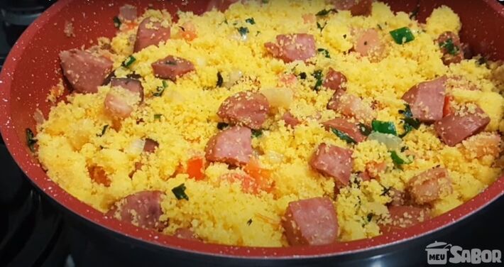 A- A+ Ingredientes 1 cebola ralada 1/2 xícara de óleo de soja 1 lata de molho de tomate 2 vezes a medida da lata, de água 1 lata de ervilha com a água 1 lata de milho em conserva (opcional) 2 gomos de linguiça calabresa triturada 3 cubos de caldo de picanha 1 xícara de azeitonas verdes picadas 1 xícara de cheiro verde picado 2 xícaras de farinha de milho Ovos cozidos Rodelas de tomate Azeitonas para enfeitar Modo de Preparo Coloque na panela o óleo e cebola. Refogue. Adicione a calabresa e frite mais um pouco. Coloque o molho, a água, a ervilha, o caldo de picanha, as azeitonas, o cheiro verde e deixe ferver por 3 minutos. Coloque a farinha de milho aos poucos até dar o ponto. Em uma forma de buraco, arrume o ovo cozido em rodelas, as rodelas de tomate e as azeitonas. Coloque a massa de cuscuz apertando bem para não sobrar nenhum espaço na forma. Deixe descansar aproximadamente 30 minutos. Desenforme. Sirva quente ou frio. Dicas do Cheff Conte-nos como ficou sua receita, poste fotos, marque e siga-nos no instagram use a #ReceitasMeuSabor. Fonte: Meu Sabor
