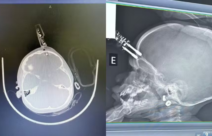 O neurocirurgião responsável pelo caso, Dr. Bruno Castro, detalhou que a paciente deu entrada na unidade com o objeto ainda fixado à cabeça.