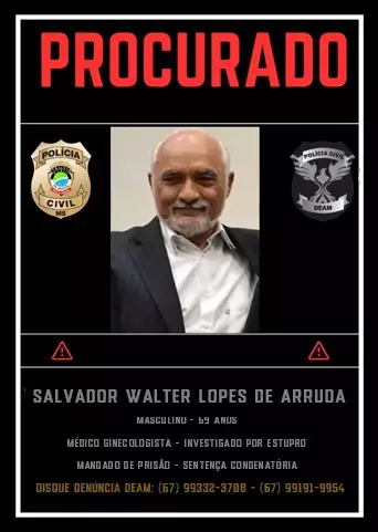 O médico ginecologista, Salvador Walter Lopes de Arruda, de 69 anos, passou a ser considerado foragido da Justiça sul-mato-grossense nesta 2ª.feira (17.abr.23). Arruda atuou por 40 anos na Capital, local onde chegou ao posto de diretor do Hospital Regional (HR).