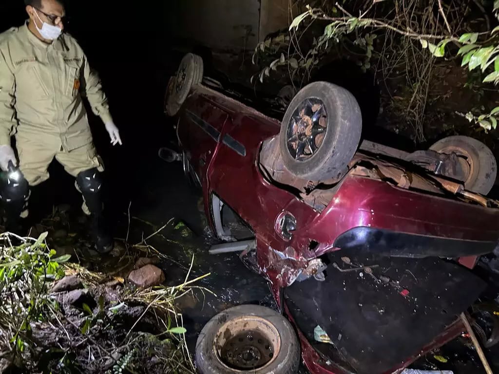 O carro caiu de uma ponte sobre o córrego Varadouro, nas proximidades do balneário Canindé.