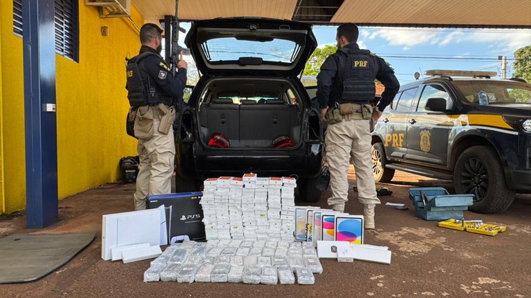 Na vistoria realizada na Unidade Operacional da PRF, os agentes encontraram fundos falsos no carro, onde estavam escondidas mais de 300 unidades de produtos eletrônicos sem nota fiscal. Entre os itens apreendidos estão celulares novos e usados, relógios inteligentes, notebooks, tablets e videogames.