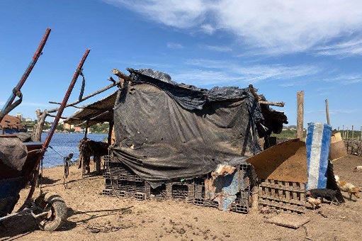 Moradia em condições degradantes era atravessada por animais. Foto: MPT As condições de habitação na fazenda eram precárias e desumanas. O casal morava em um barracão improvisado, de chão batido, com paredes e telhado feitos de caixas plásticas, madeiras e lonas. Não havia móveis, utensílios básicos e instalações sanitárias adequadas, obrigando-o a fazer suas necessidades no mato. Antes mesmo de habitar no alojamento improvisado, o trabalhador e sua companheira foram menosprezados pelo pecuarista, sujeitos a morar, durante um mês, em um chiqueiro de porcos.