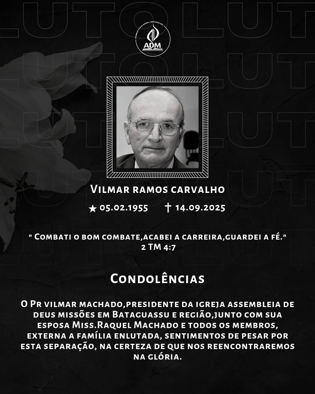Cientes da dor que traz esta separação, pedimos ao Senhor Jesus que lhes conceda o merecido consolo. 'Preciosa é à vista do Senhor a morte dos seus santos.' Salmos 116:15".