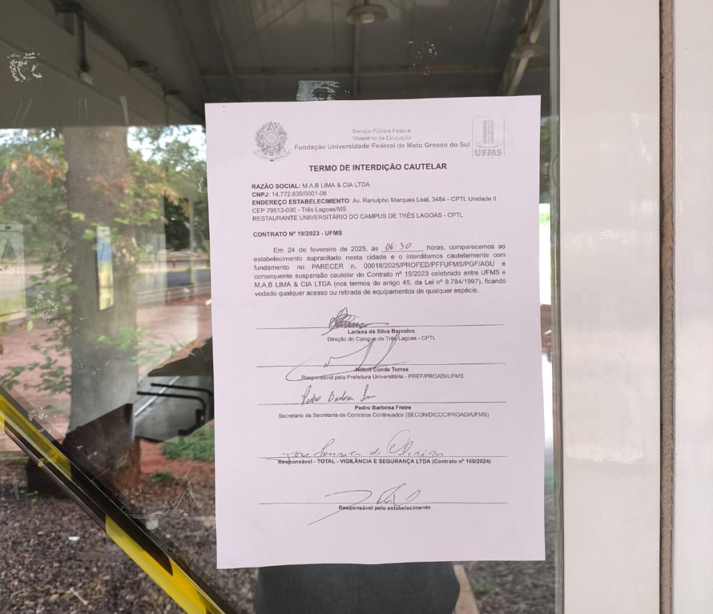 A Universidade Federal de Mato Grosso do Sul (UFMS) interditou, nesta segunda-feira (24), o Restaurante Universitário (RU) do Câmpus de Três Lagoas e suspendeu o contrato com a empresa M.A.B LIMA & CIA LTDA, após indícios de irregularidades.