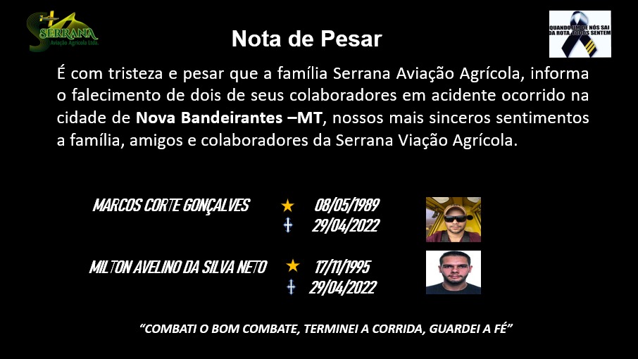 Imagens enviadas ao MS Notícias mostram destroços do avião agrícola de uma empresa de São Gabriel do Oeste (MS) que caiu numa área de fazenda a 100 quilômetros de Nova Bandeirantes (MT). O acidente aconteceu na tarde da sexta-feira (29.abr.22) e matou o piloto Marcos Corte Gonçalves, de 32 anos, e o auxiliar de pista, Milton Avelino Neto, de 27 anos. Eles eram funcionários da Serrana Aviação Agrícola, de MS.