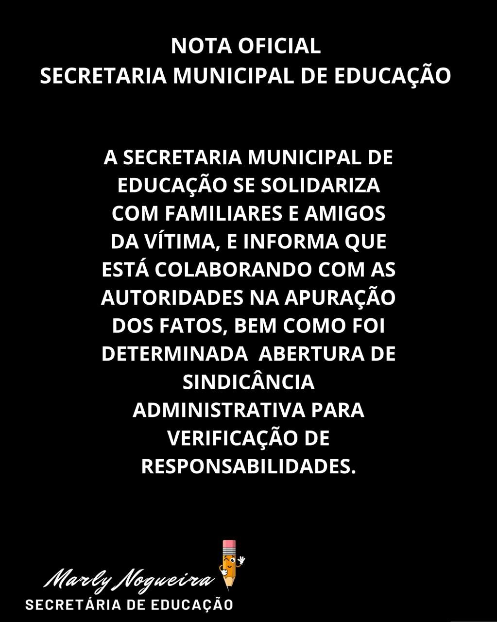 Secretária Municipal de Educação, Marly Nogueira de Lima, publicou um stories que chamou de nota oficial, afirmando "mandou abrir procedimento administrativo para apurar o ocorrido no acidente que ceifou a vida da universitária".